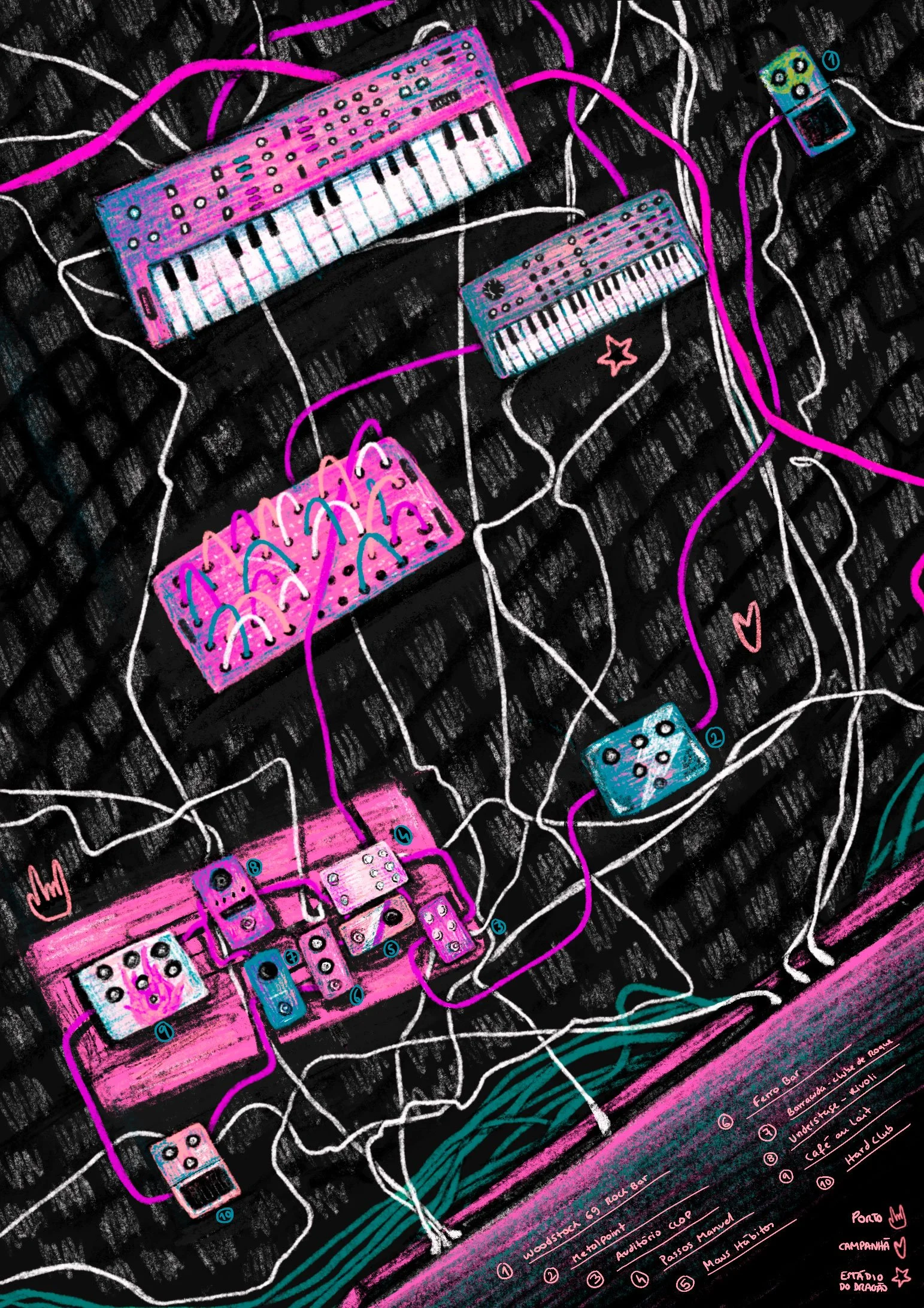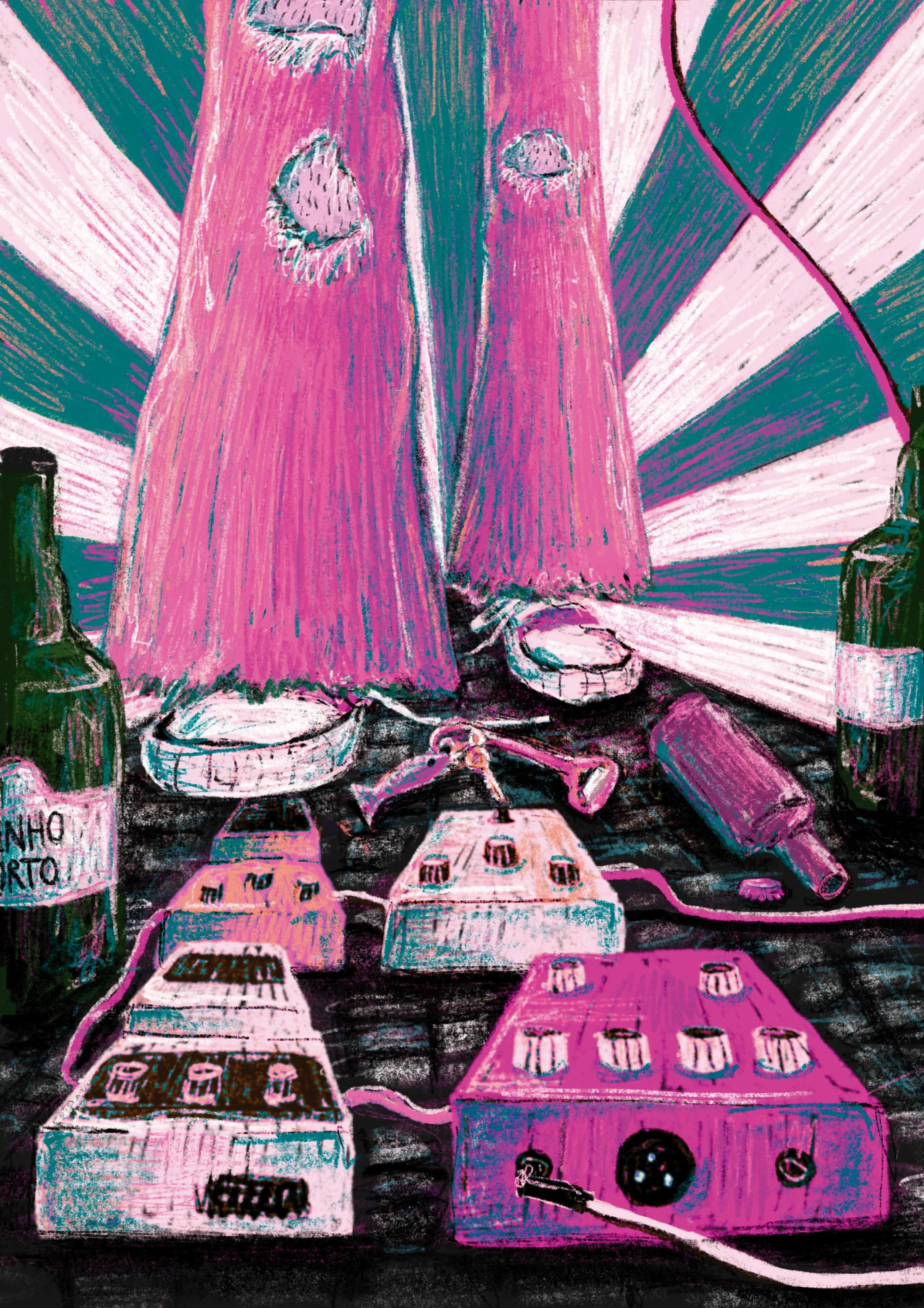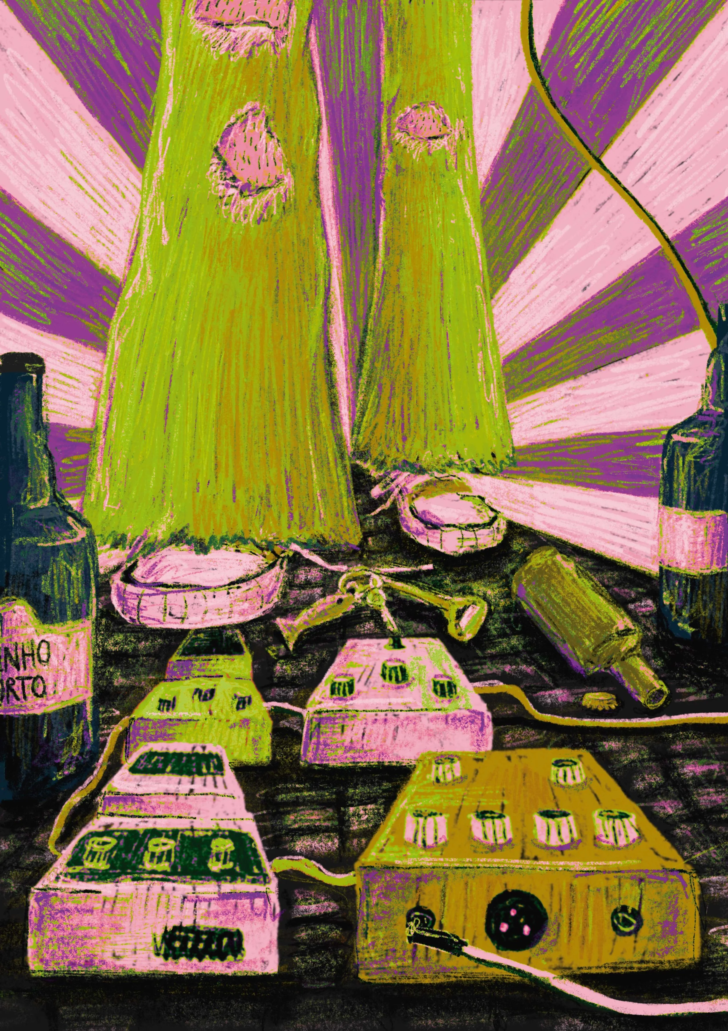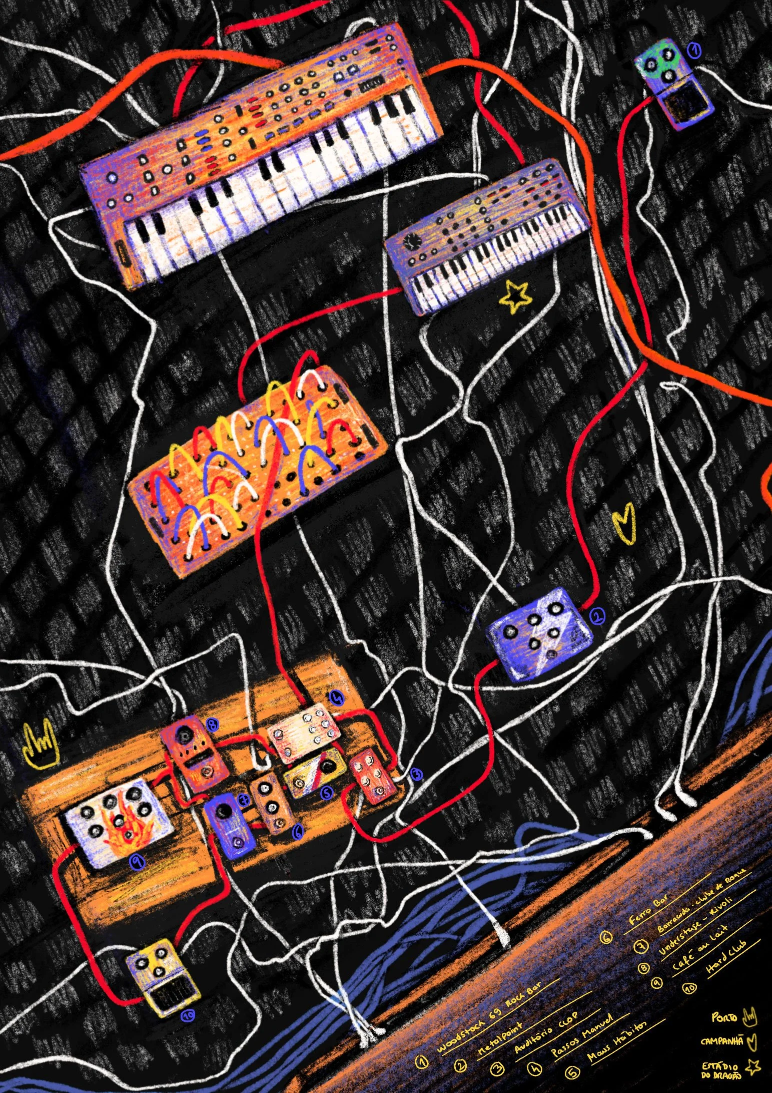 For the representation of the theme itself, I focused on elements that are present in most concert venues and are essential for creating music, which are the pedals, synthesizers and cables scattered everywhere. With these elements in mind, I started by sketching an idea of a foot that presses on the pedals, in a surrounding that represents the city of Porto, with the bottles of port wine or the portuguese floor work.